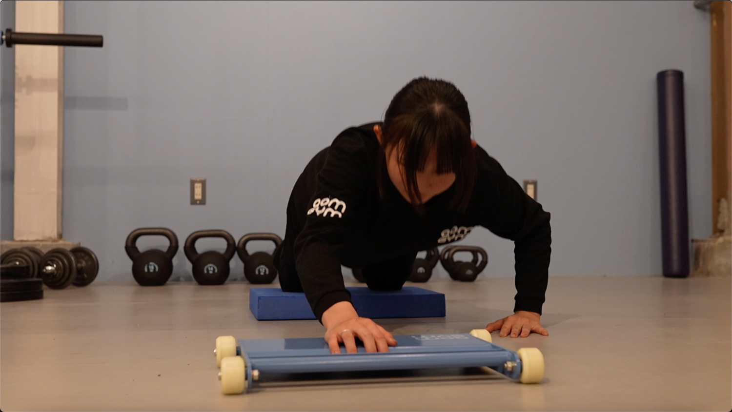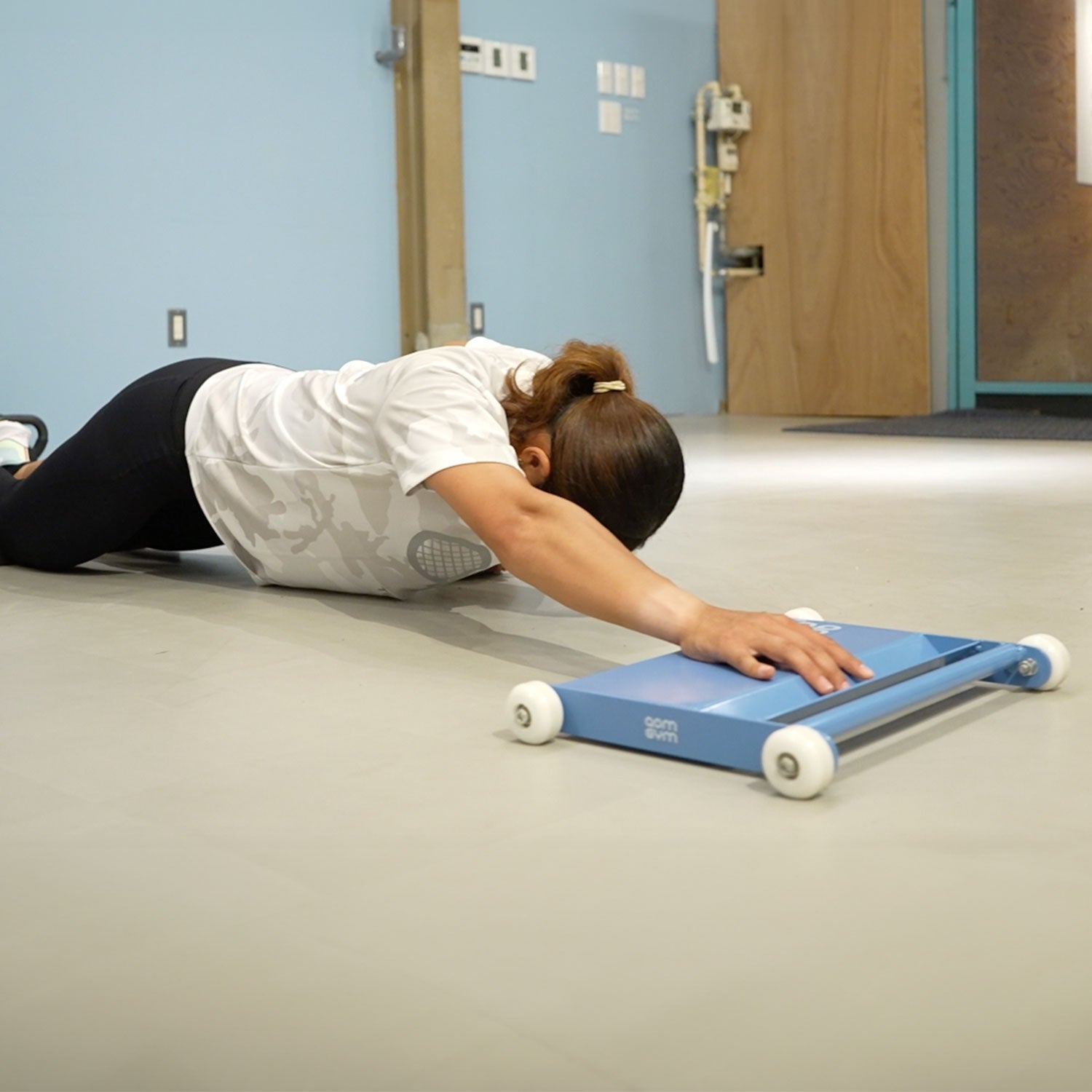 いつもと違う感覚ではありませんか?体幹の力をうまく使えないと、sliderが後ろに転がっていって地面にお腹がついてしまいそう。腕立て伏せの動きの中でも体幹部を安定させられるようにしっかりドローインをしてください。これが動きの中で体幹を使うということです。